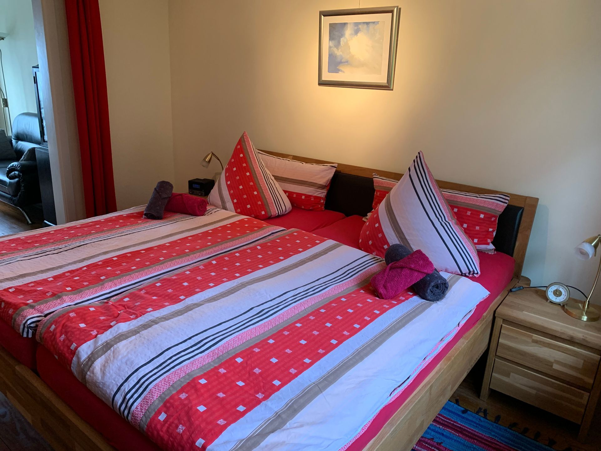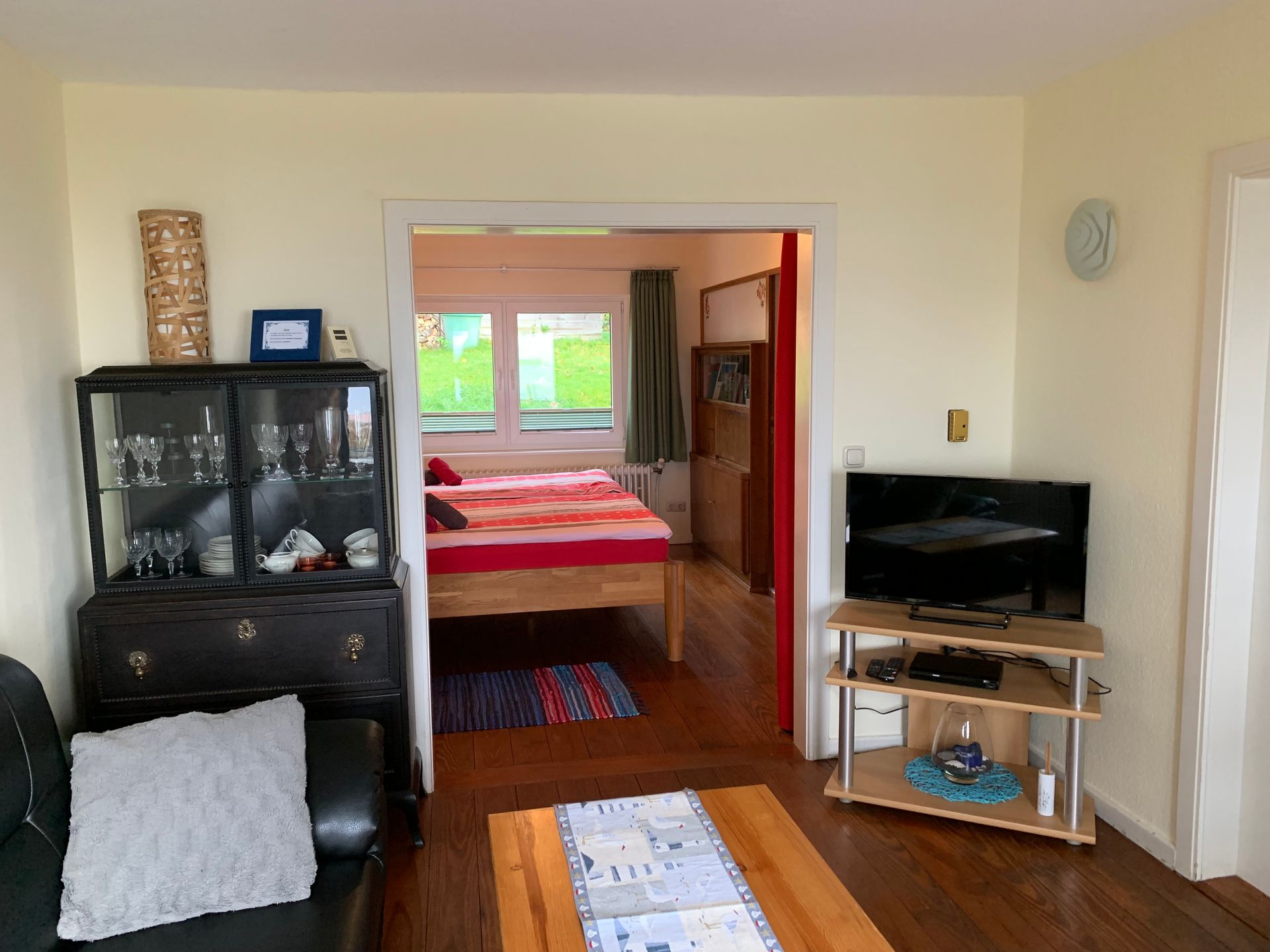 Beide Räume sind durch einen Vorhang voneinander getrennt. Im Wohnzimmer steht Ihnen eine Coach sowie zwei Stühle an einem Glastisch, ein SatTV und ein Radio zur Verfügung.